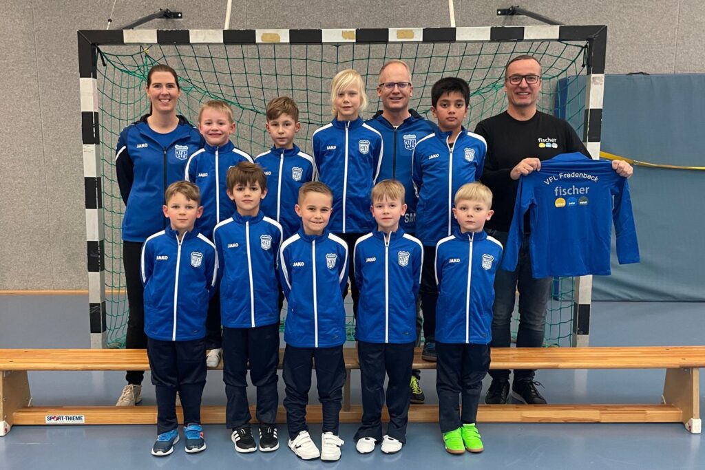 Die Spieler der u8 des VfL Fredenbeck freuen sich über die neuen Trainingsanzüge von der Firma Fischer-Bargstedt.